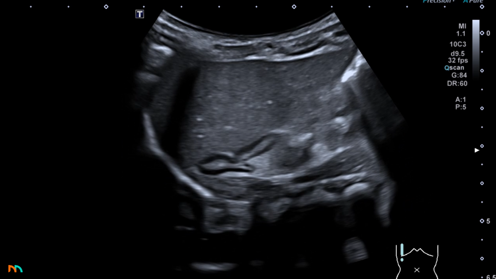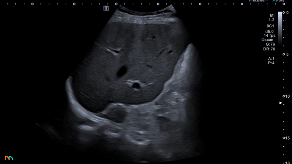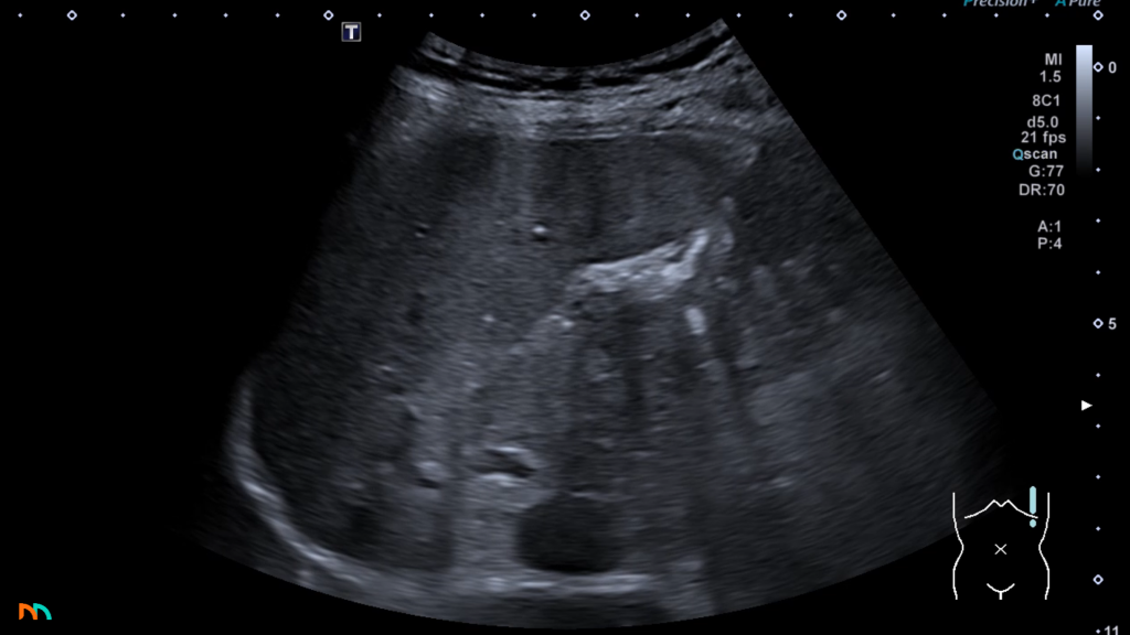 Po prawej stronie pole nadnerczowe jest łatwiejsze do zlokalizowania i zobrazowania. Zazwyczaj mamy bardzo dobre okno akustyczne w postaci prawego płata wątroby. Do tego mamy dodatkowy punkt nawigacyjny w postaci żyły głównej dolnej. Warto zatem zapamiętać, że prawe pole nadnerczowe położone jest pomiędzy górnym biegunem nerki prawej, a żyłą główną dolną, poniżej i do tyłu względem prawego płata wątroby. W tej okolicy w prawidłowych warunkach stwierdzamy jednorodny, echogeniczny obszar tkanek zaotrzewnowych i to właśnie tam znajduje się nadnercze. W przypadku gdy nie widzimy w tym obszarze żadnych separujących się ognisk, uznajemy że obraz pola nadnerczowego jest prawidłowy.