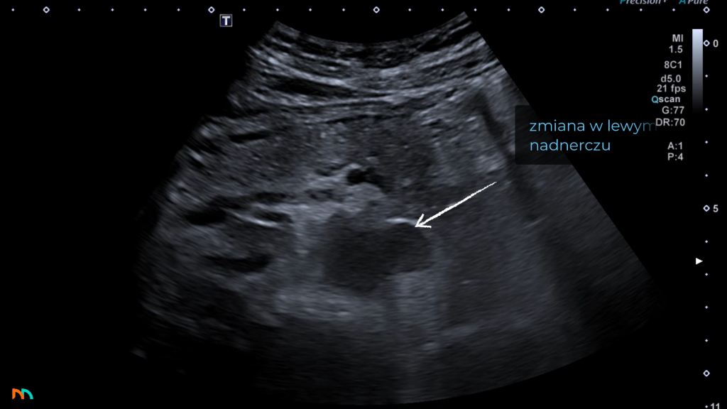 Po stronie lewej sytuacja jest nieco bardziej, z punktu widzenia ultrasonografii, złożona. Samo położenie pola nadnerczowego jest podobne jak po stronie prawej, szukamy go dogłowowo, do przodu i przyśrodkowo w stosunku do bieguna górnego nerki lewej. Niestety w tej lokalizacji nie mamy okna akustycznego w postaci wątroby, a żołądek oraz zagięcie śledzionowe okrężnicy, które często skutecznie ten obszar przesłaniają. Mimo to w badaniu nie powinniśmy pomijać tej okolicy. W związku z trudniejszymi warunkami insonacji stwierdzamy zmiany nadnercza lewego, dopiero gdy osiągną odpowiedni kaliber, w praktyce jest to średnica 20-30mm. Zdarza się, że zmian ogniskowych lewego nadnercza nie jesteśmy w stanie zobrazować, nawet wiedząc o ich obecności z innych badań obrazowych.